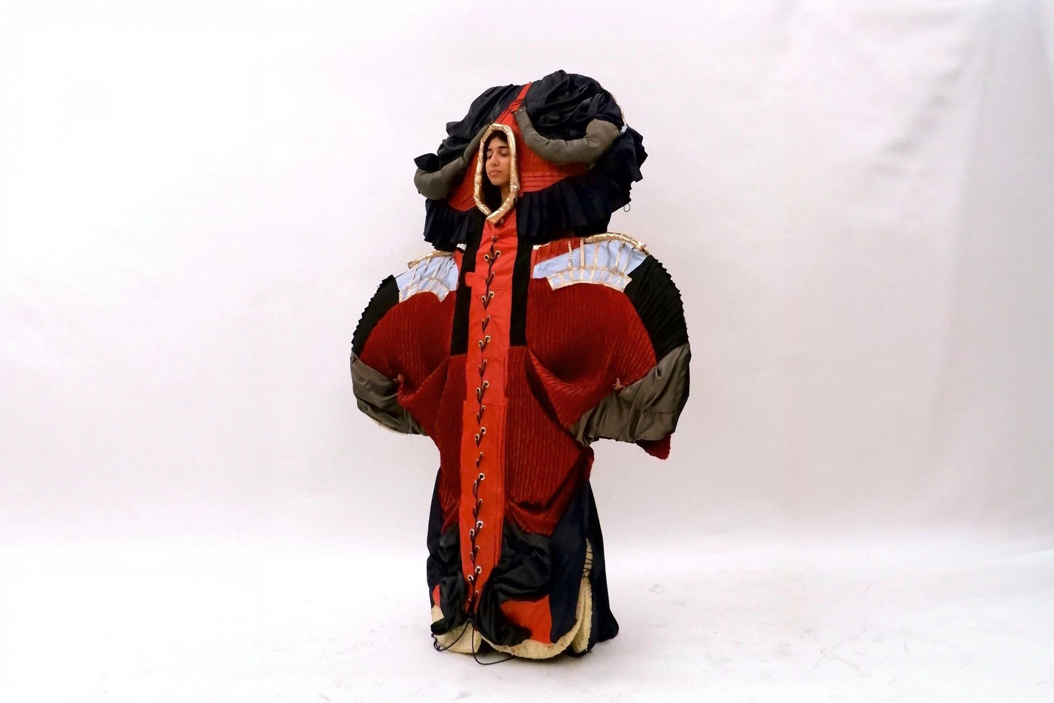 Photos by Ava Hudson. Recycled mattress foam, curtain racks, grommets, yarn, fabric from vintage winter-wear.